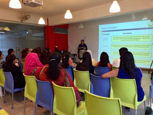 ’پاکستانی خواتین کا بہت بڑا مسئلہ ہے کہ ان کو مارکیٹنگ کرنی نہیں آتی۔ ان کو اپنی مصنوعات، چاہے کتنی بھی اچھی ہوں، اسے بیچنا نہیں آتا۔ اس ٹریننگ کے ذریعے ہم ان کو یہ اشیا بیچنا سکھائیں گے۔ دوسری طرف انھیں یہ بھی سمجھائیں گے کہ ان کی پراڈکٹ ڈیویلپمنٹ کیا ہے۔ آج کل لوگوں کی کیا ضروریات ہیں اور ان کو کس طرح کے پراڈکٹ لانی چاہییں تاکہ لوگوں کی وہ ضروریات پوری ہو سکیں۔‘